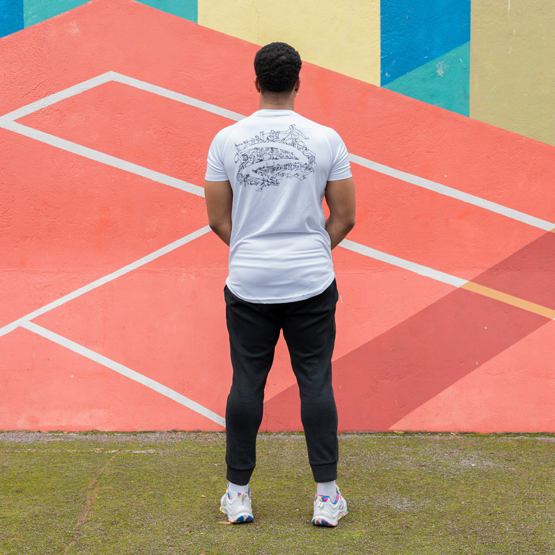 Lightweight stretch tee (95/5 poly-spandex blend) with DTF front/back print.