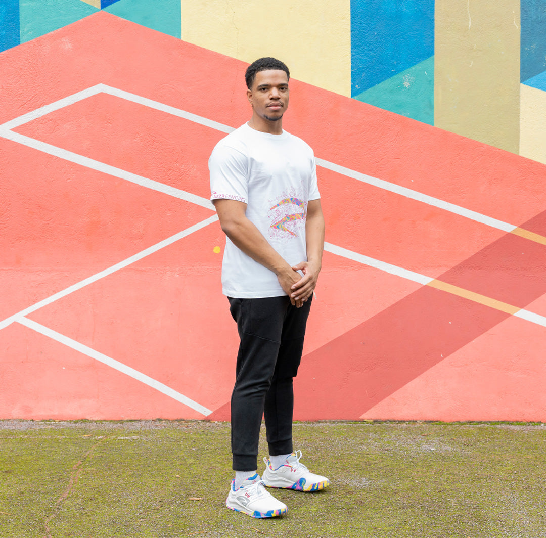 cushioned sustainable material made of recycled EVA. The sole absorbs the impact of jumps,